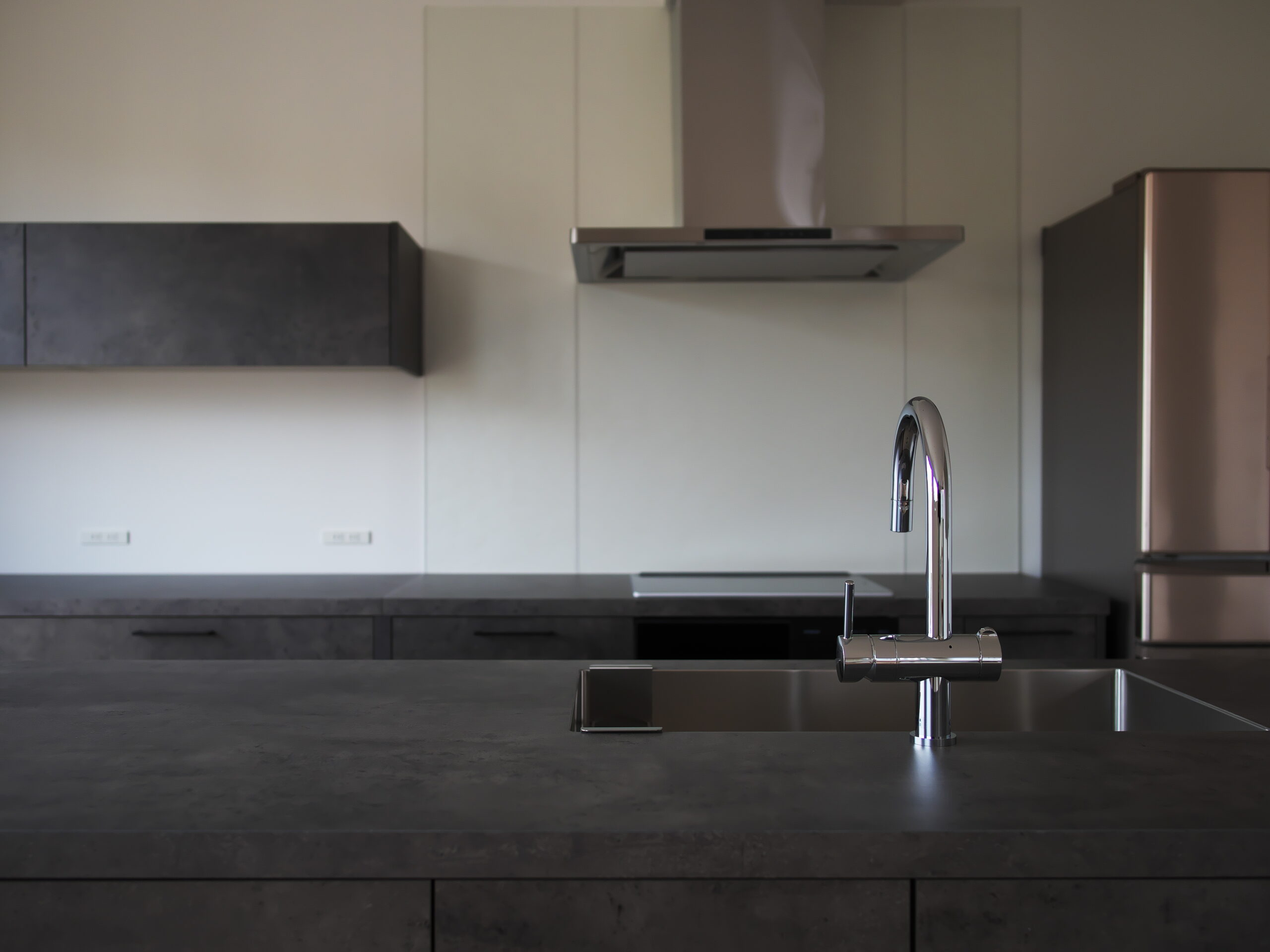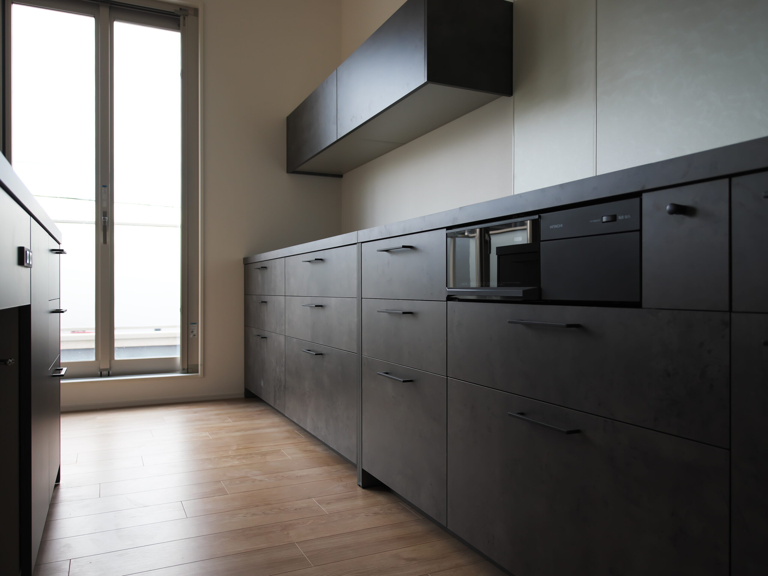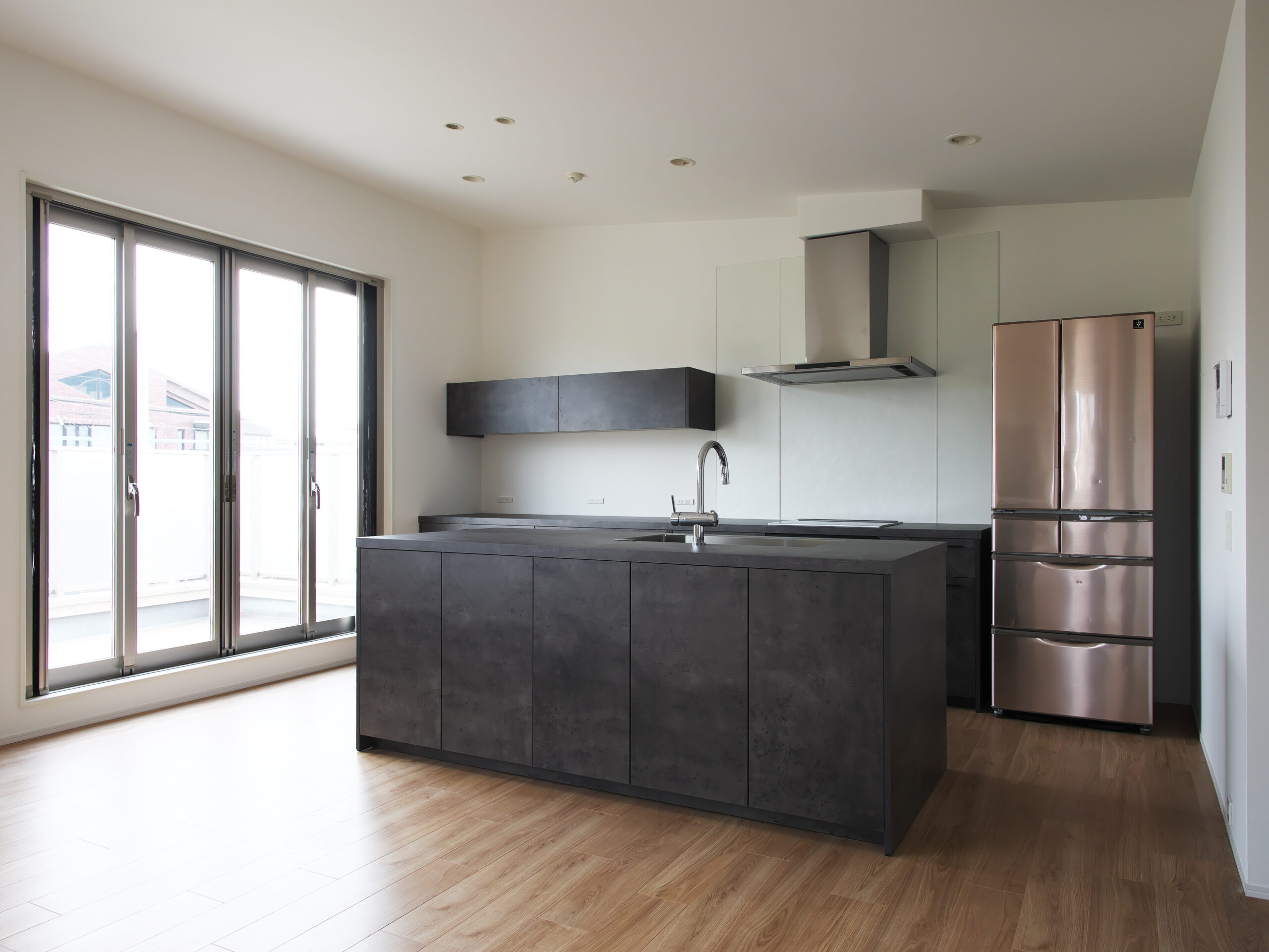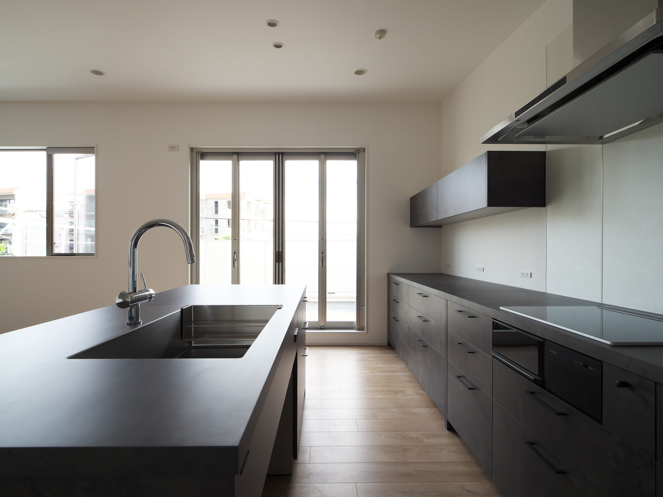 兵庫県芦屋市における戸建て住宅のリフォームプロジェクト。 白を基調とした空間に重厚なアイランドキッチンを据え、全体の印象を引き締めています。 洗練された素材と無垢材の温もりが調和する、家族が自然と集まる上質な住まいを形にしました。