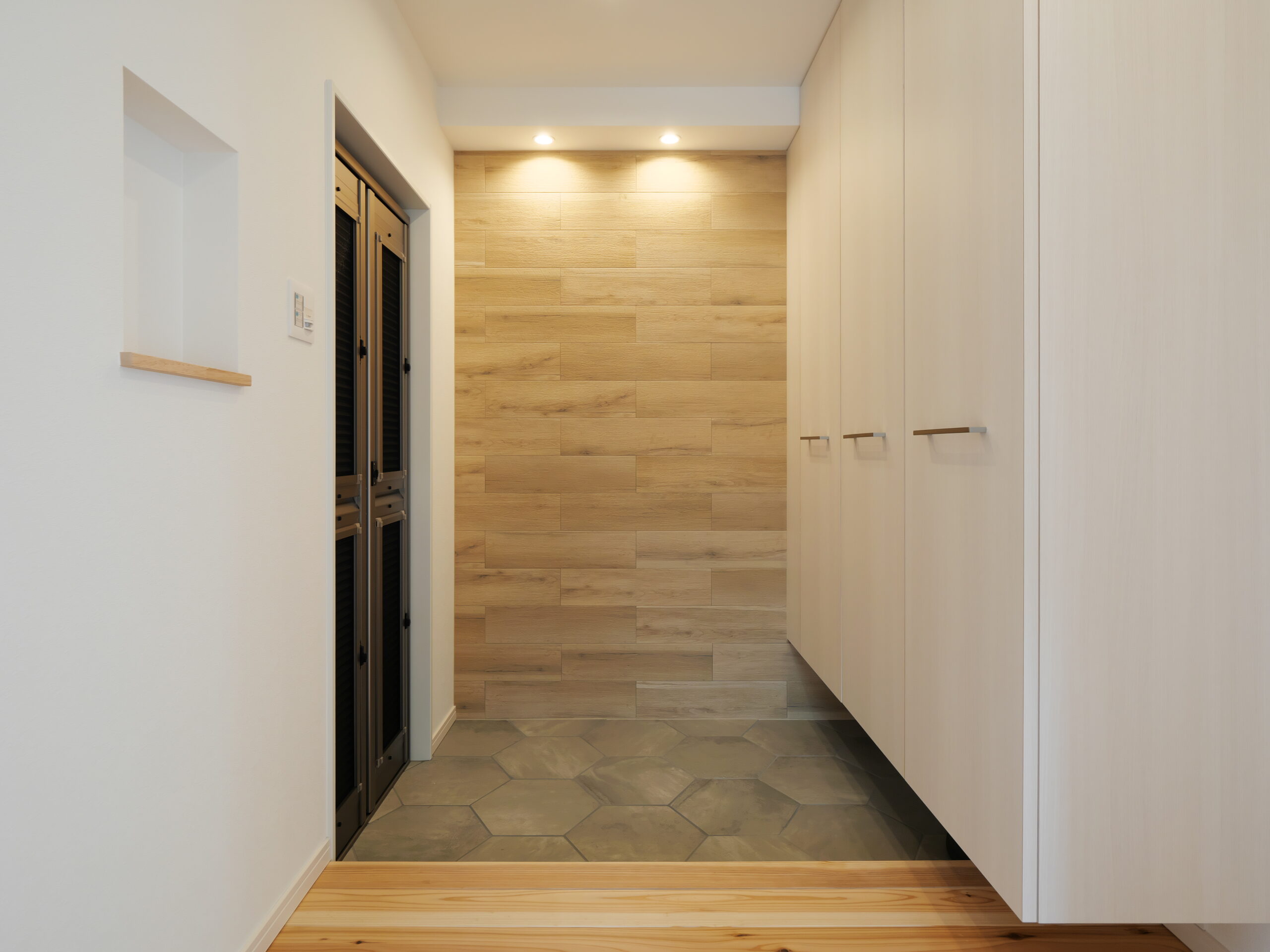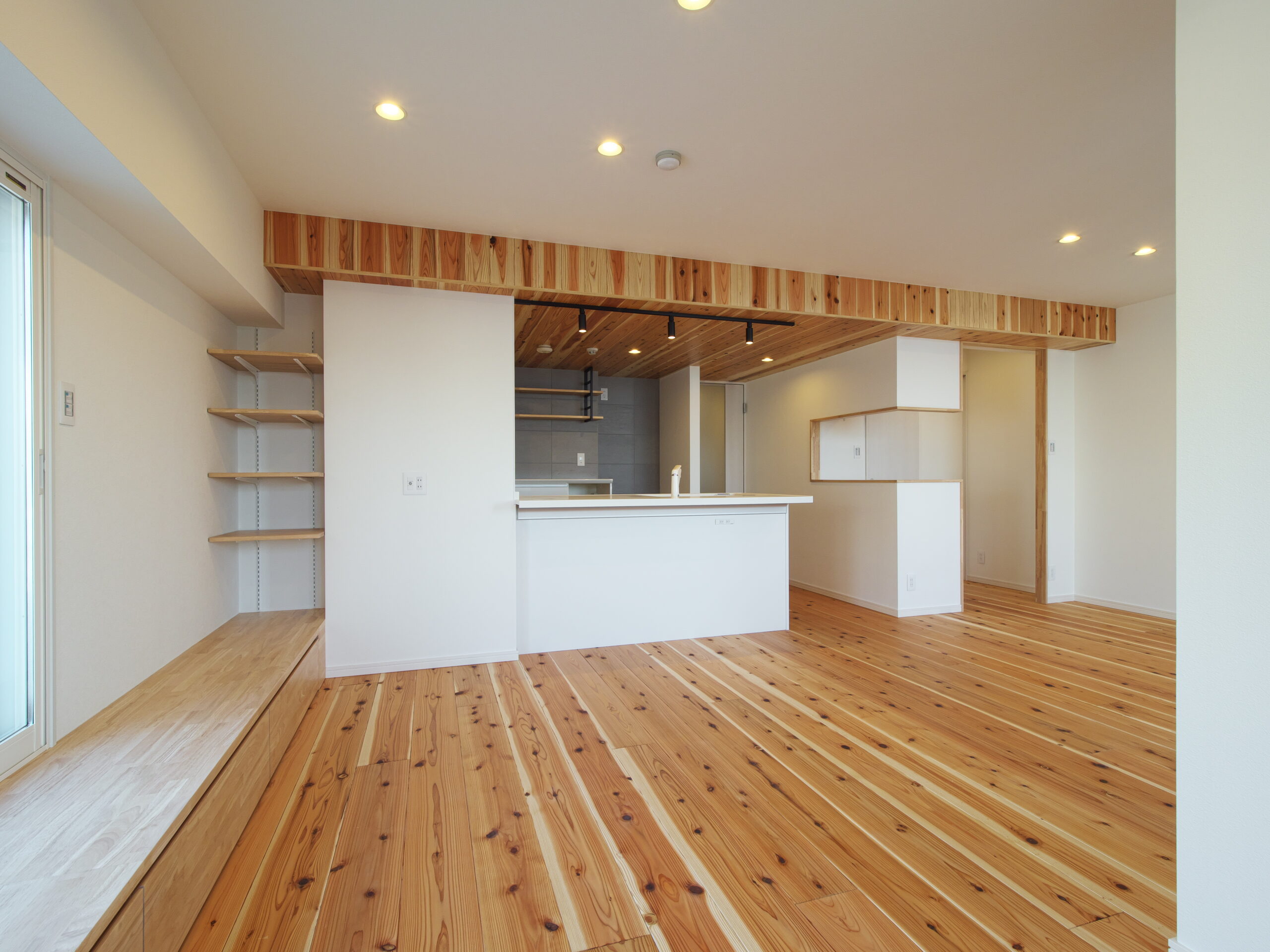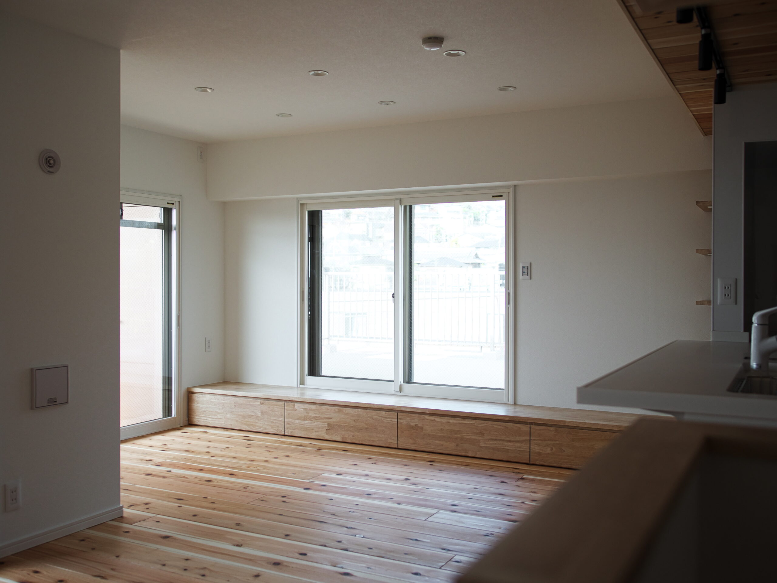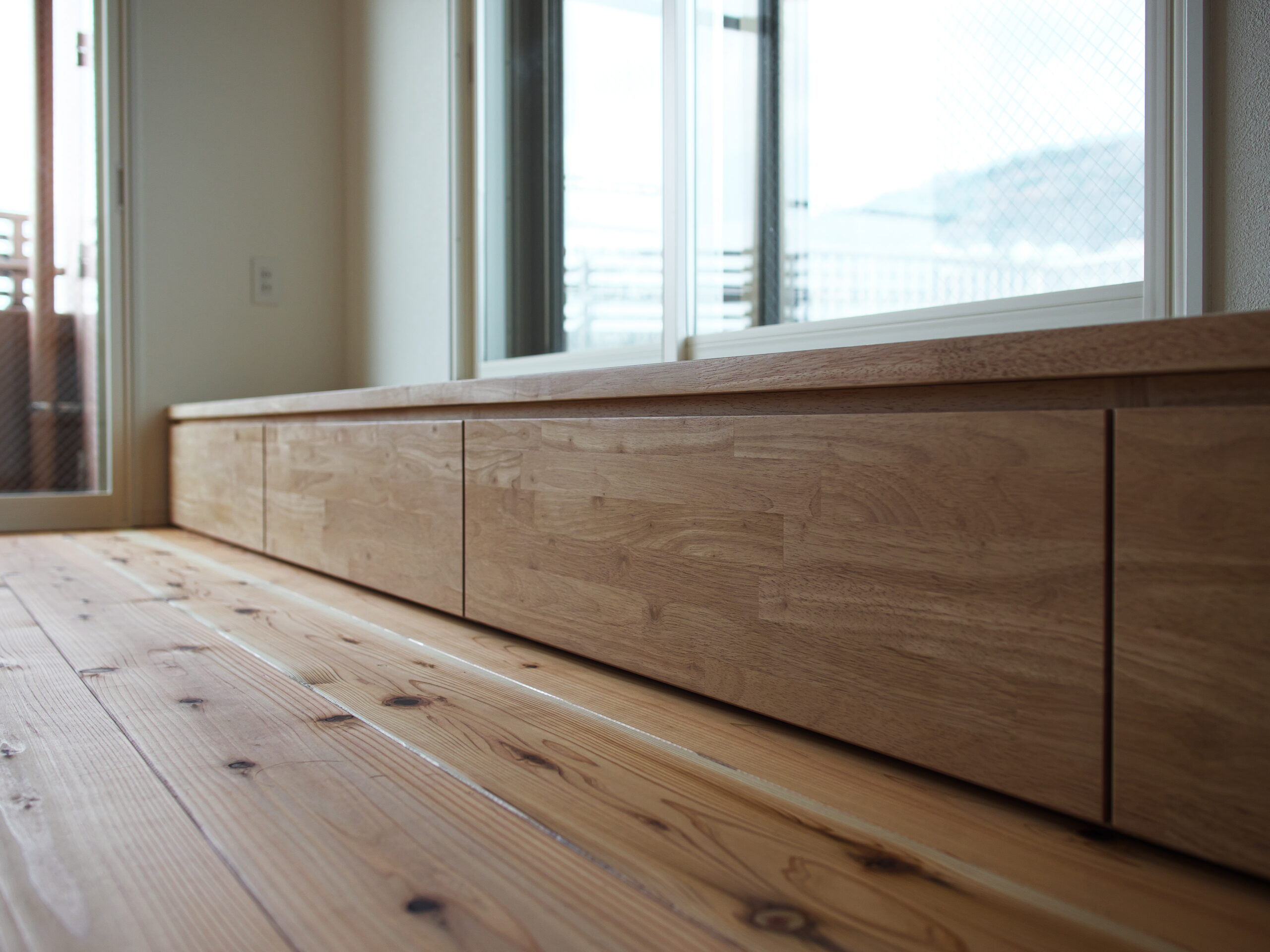 兵庫県芦屋市におけるマンションのリノベーションプロジェクト。 無垢材を贅沢に使用し、木の香りと温もりに満ちた明るいLDKへと一新しました。 窓際の造作ベンチやヘキサゴンタイルなど、細部の設えが光る上品な住空間を実現しています。